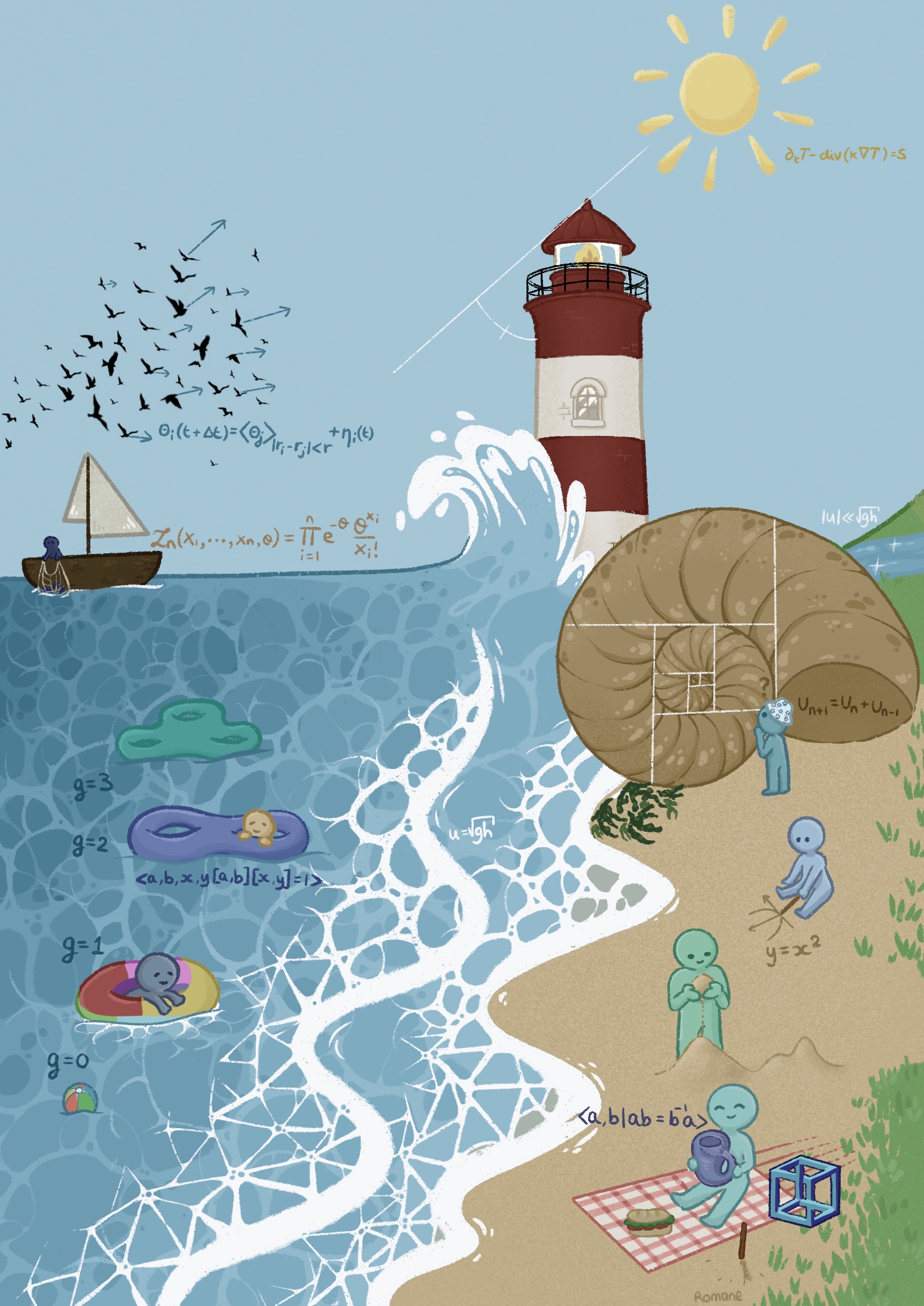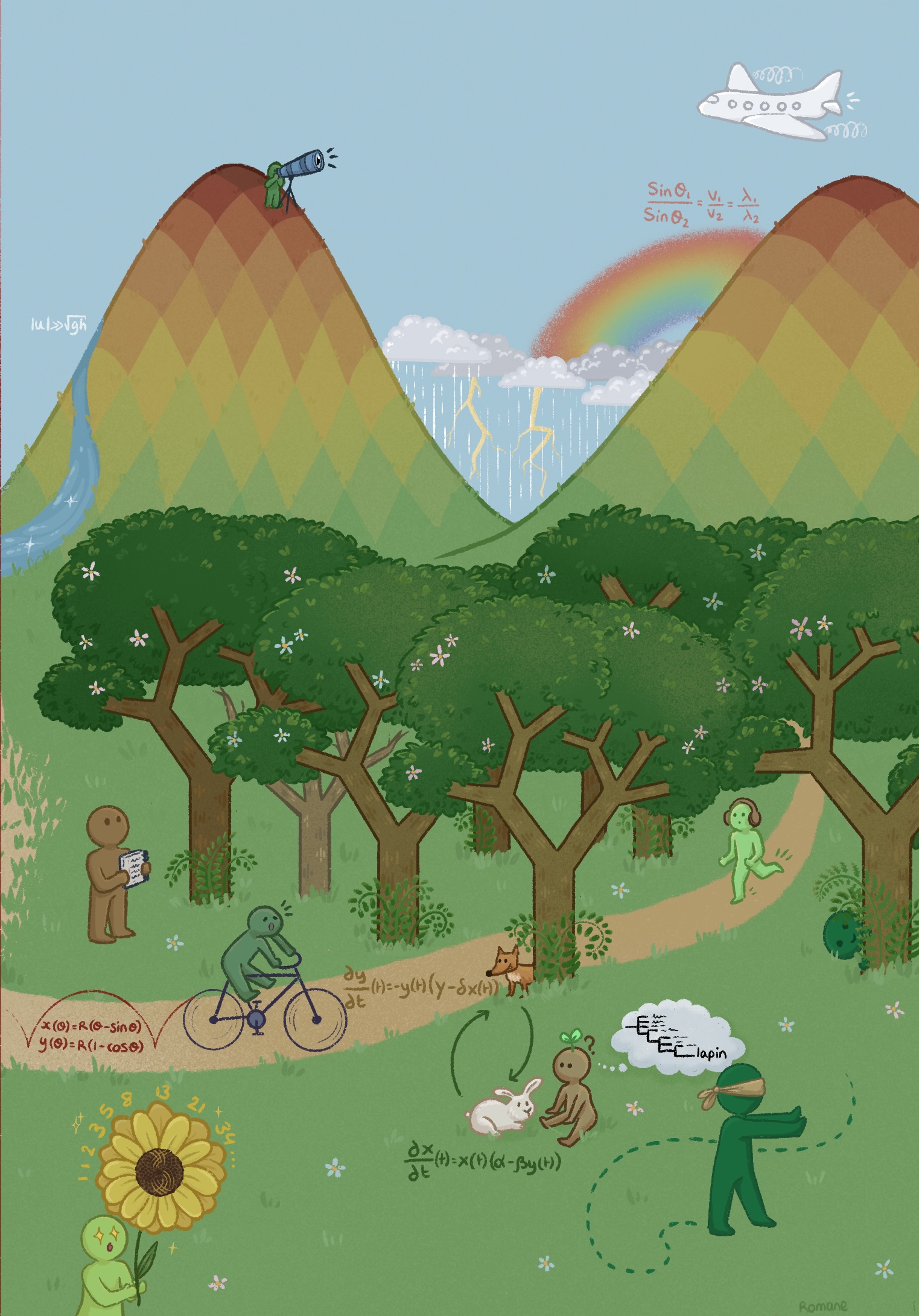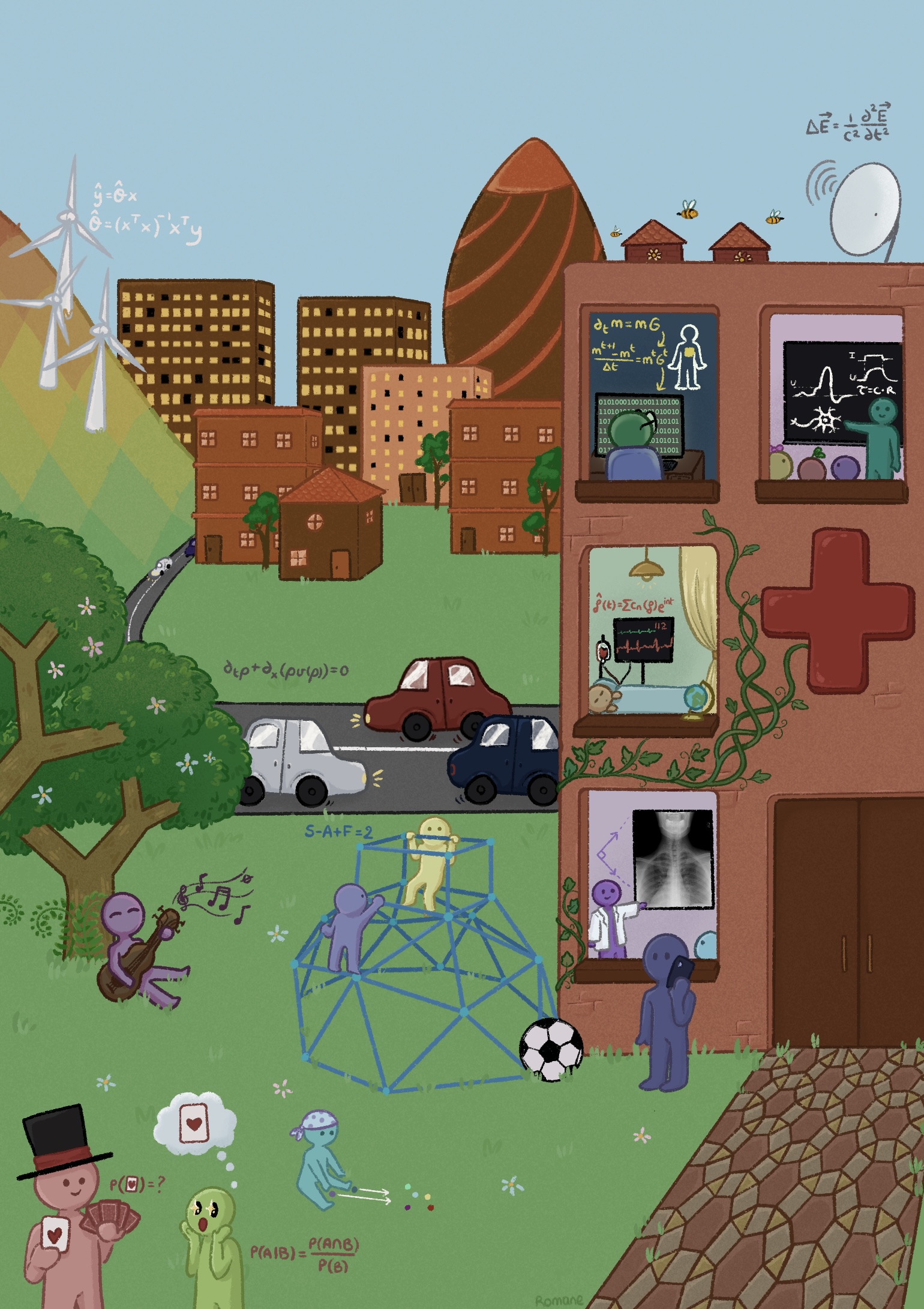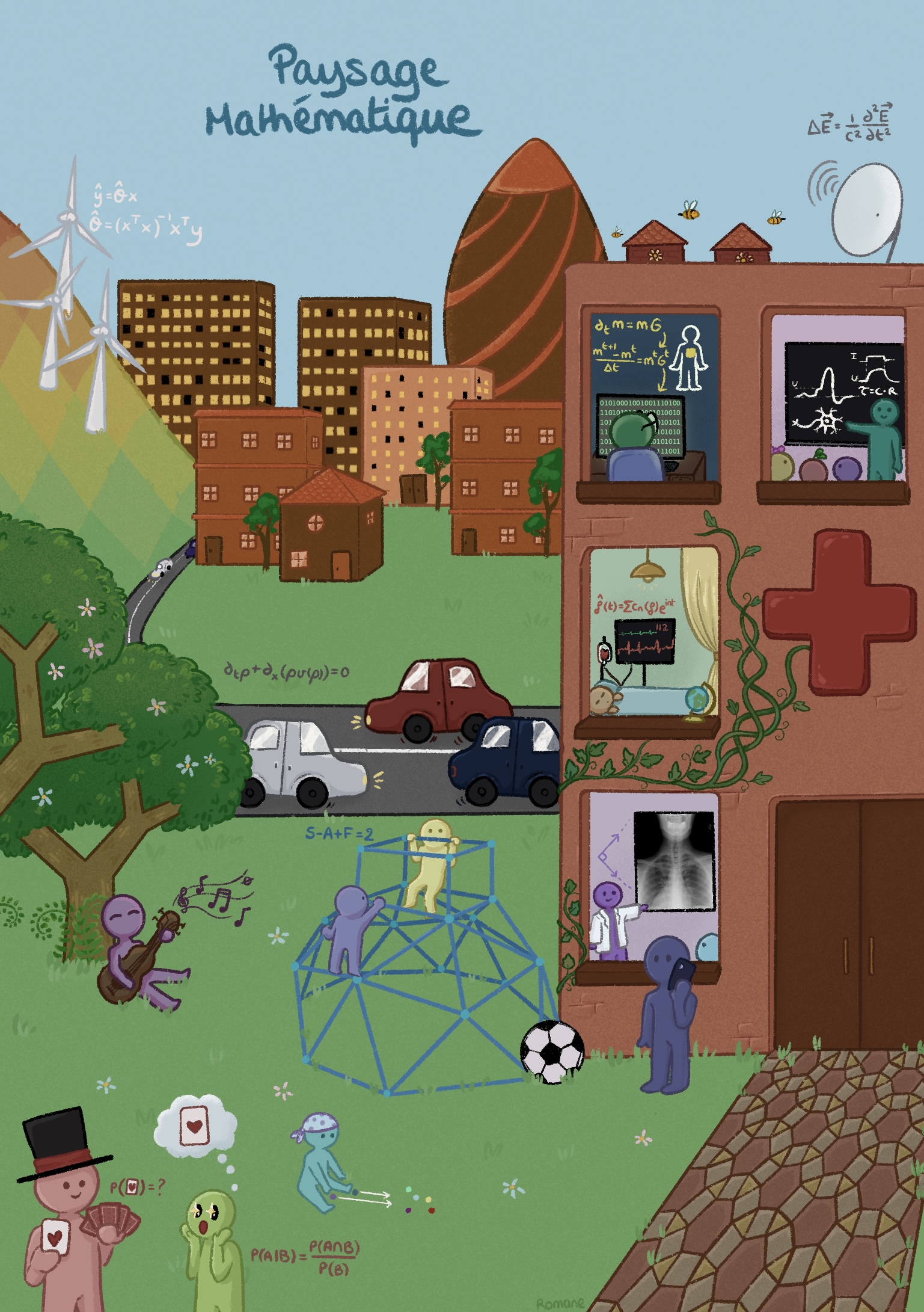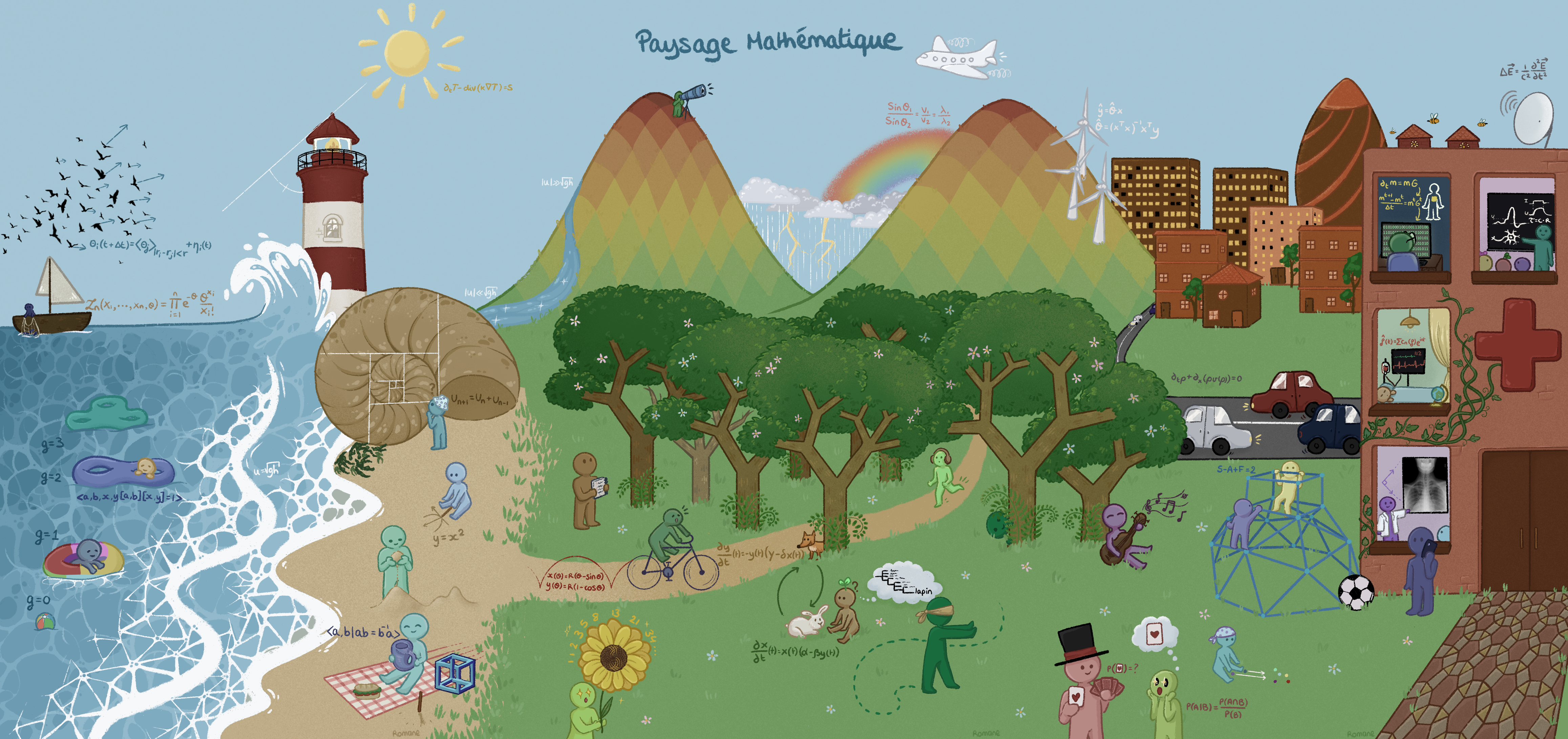 Cette illustration éclaire la diversité des mathématiques, et leurs liens avec notre environnement. L'esthétique enfantine de l'image, similaire à un jeu de cherche et trouve, est un choix délibéré pour attirer l'attention d'un large public.